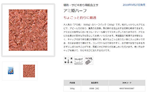 青色の小さくてかわいらしいパッケージがアミ姫ハーフになります。大人気のアミ姫のハーフパックとなっており、容量は300gです。朝夕のマズメ時の短時間釣行にちょこっと使ったり、アミコマセが少し足りない時の補充用として使ったり、コンパクトな容量のため使い勝手は良いかと思います。使い方・釣り方はアミ姫のスタンダードタイプと同じですし、もちろん中身も同じなので、魚集力は申し分なく、また釣果も期待できます。