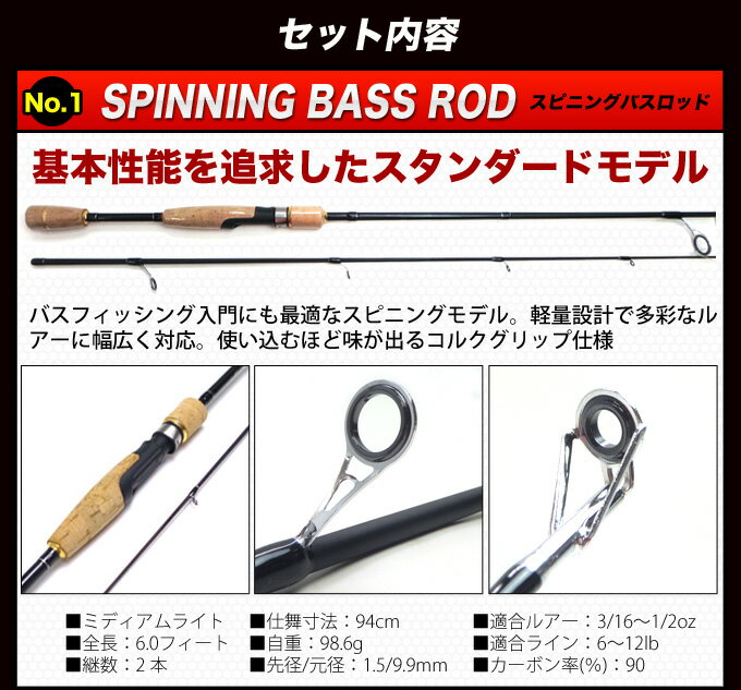 (5)【送料無料】ブラックバス釣り 入門 セットEX [スピニングモデル][タイプ-1]/ロッド/ビギナー向け/初心者/ルアーセット/ワーム/ブラックバス/釣り竿/釣具/バスフィッシング/バスロッド/スピニング